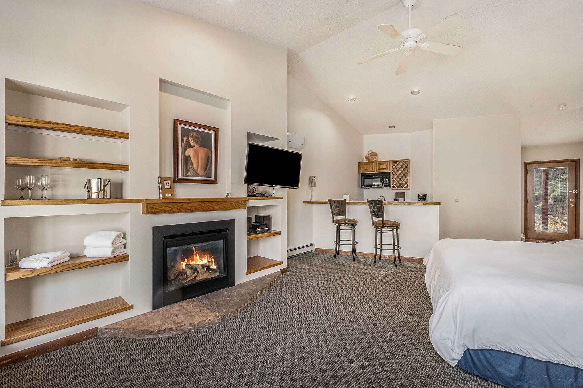 Get comfortable in your private, one bedroom apartment. Relax on your riverfront deck. Hang out in your living room featuring a gas fireplace, kitchenette, and 42” TV and mountain views. Unwind in the oversized jetted tub in the bathroom. Retire to a luxurious Queen bed in the separate bedroom that has its own TV. It’s perfect for a couple, but spacious enough for a family of four.