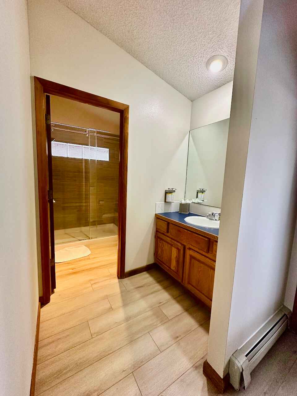 Proceeding through the kitchen, you reach the bedroom with a queen bed, walk-in closet, and an additional TV. The bathroom is spacious and features a shower/tub combo.